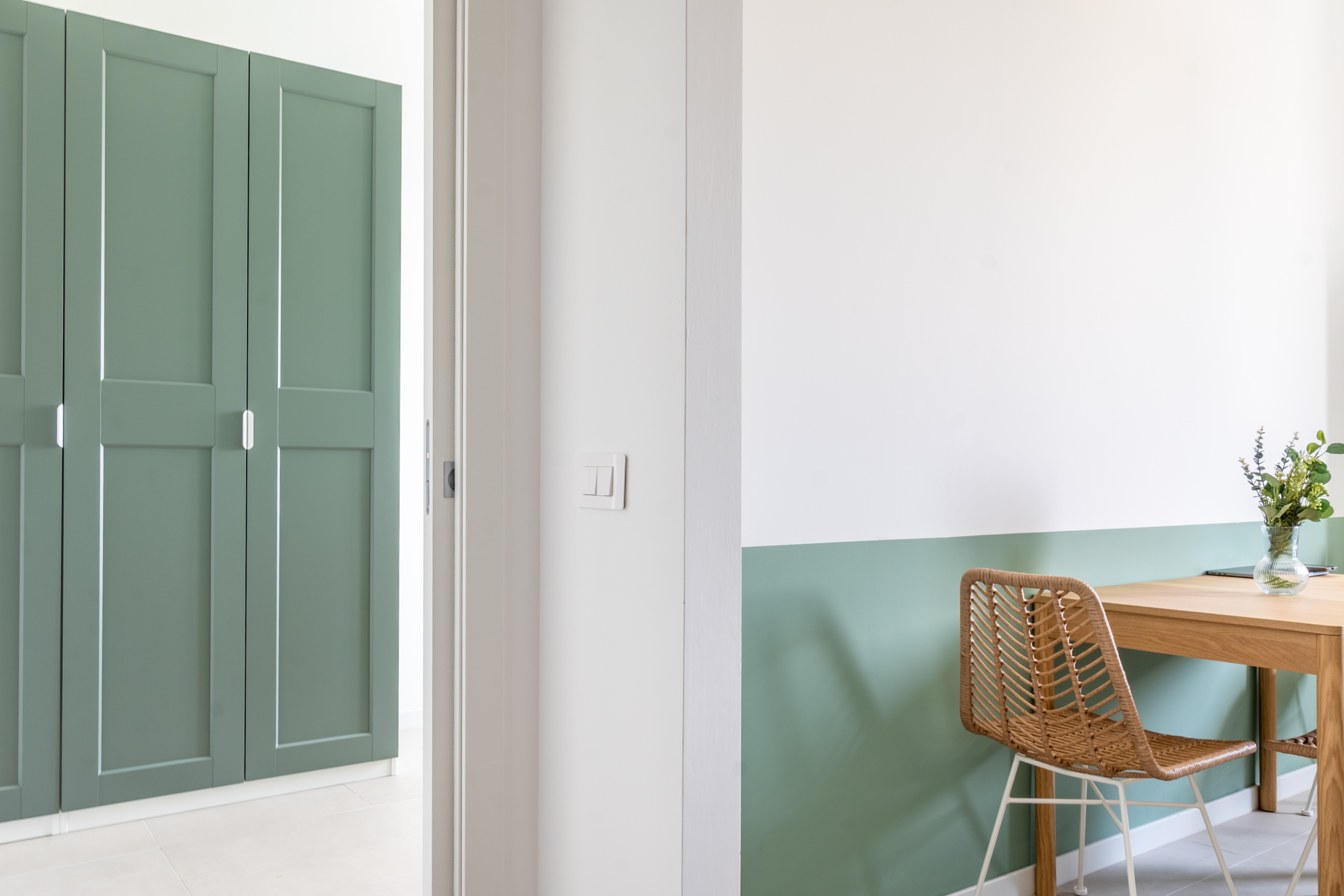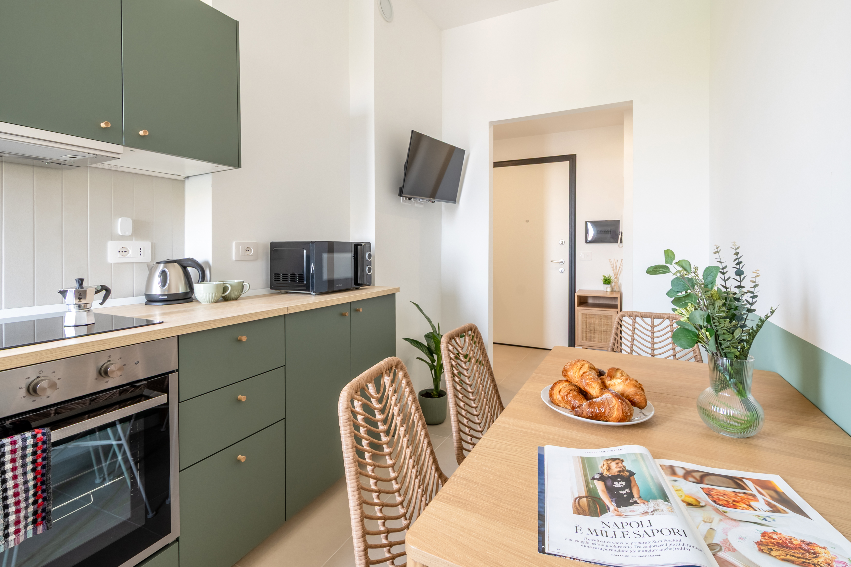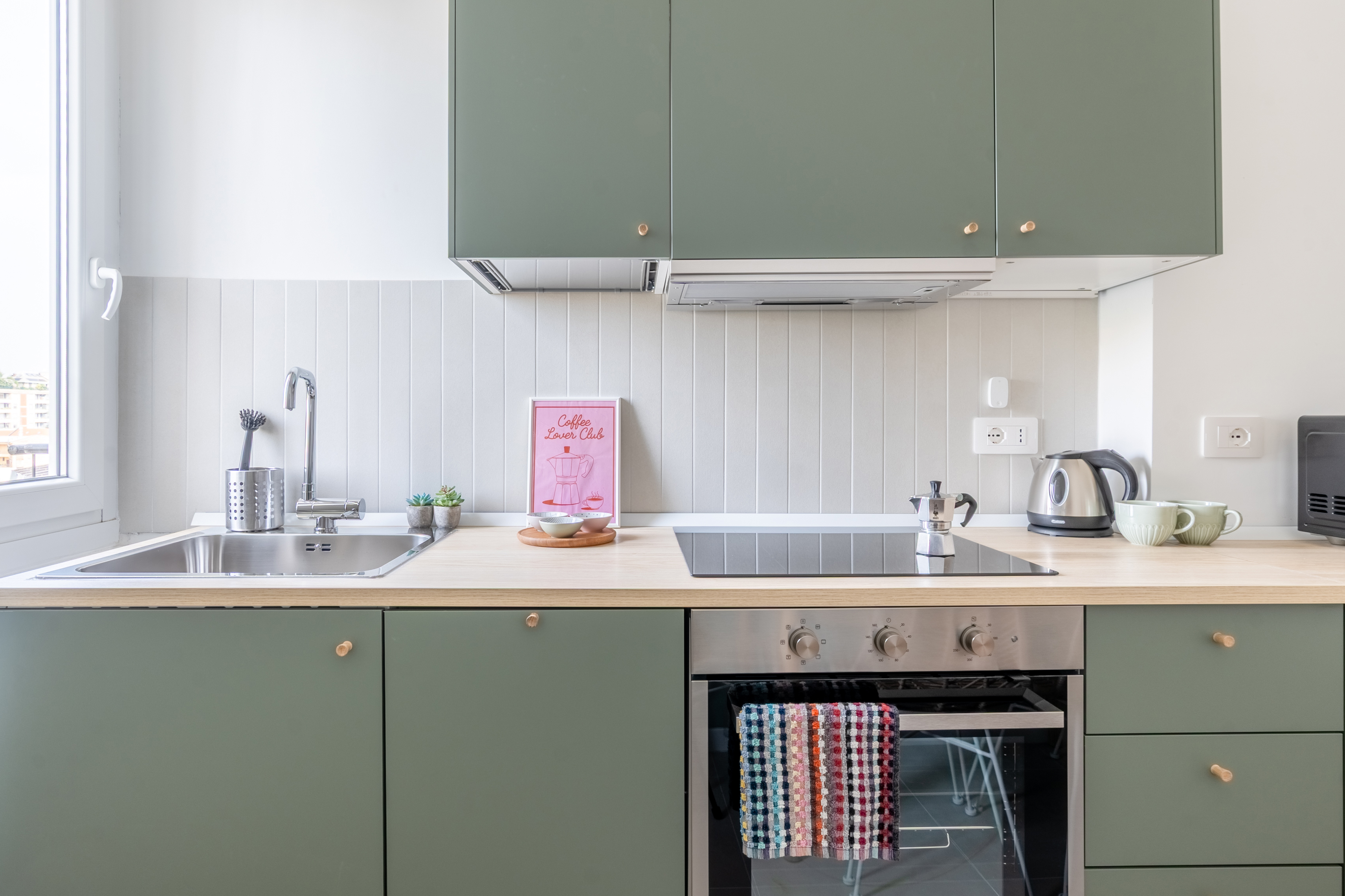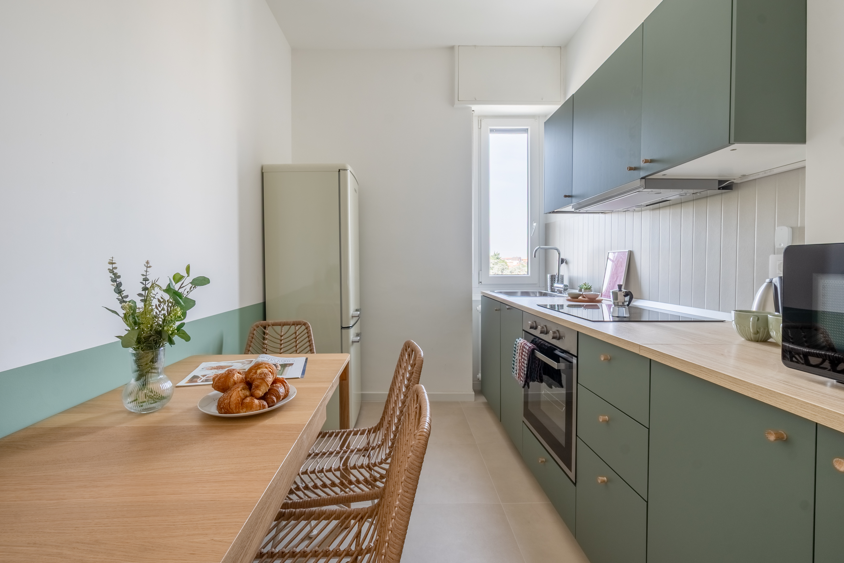 Oltre alle due camere, ciascuna con una propria personalità definita da un colore distintivo – firma stilistica degli appartamenti Roofinders – abbiamo creato spazi condivisi pensati per la quotidianità: un ingresso pratico, una cucina abitabile con un grande tavolo per stare insieme e un bagno.