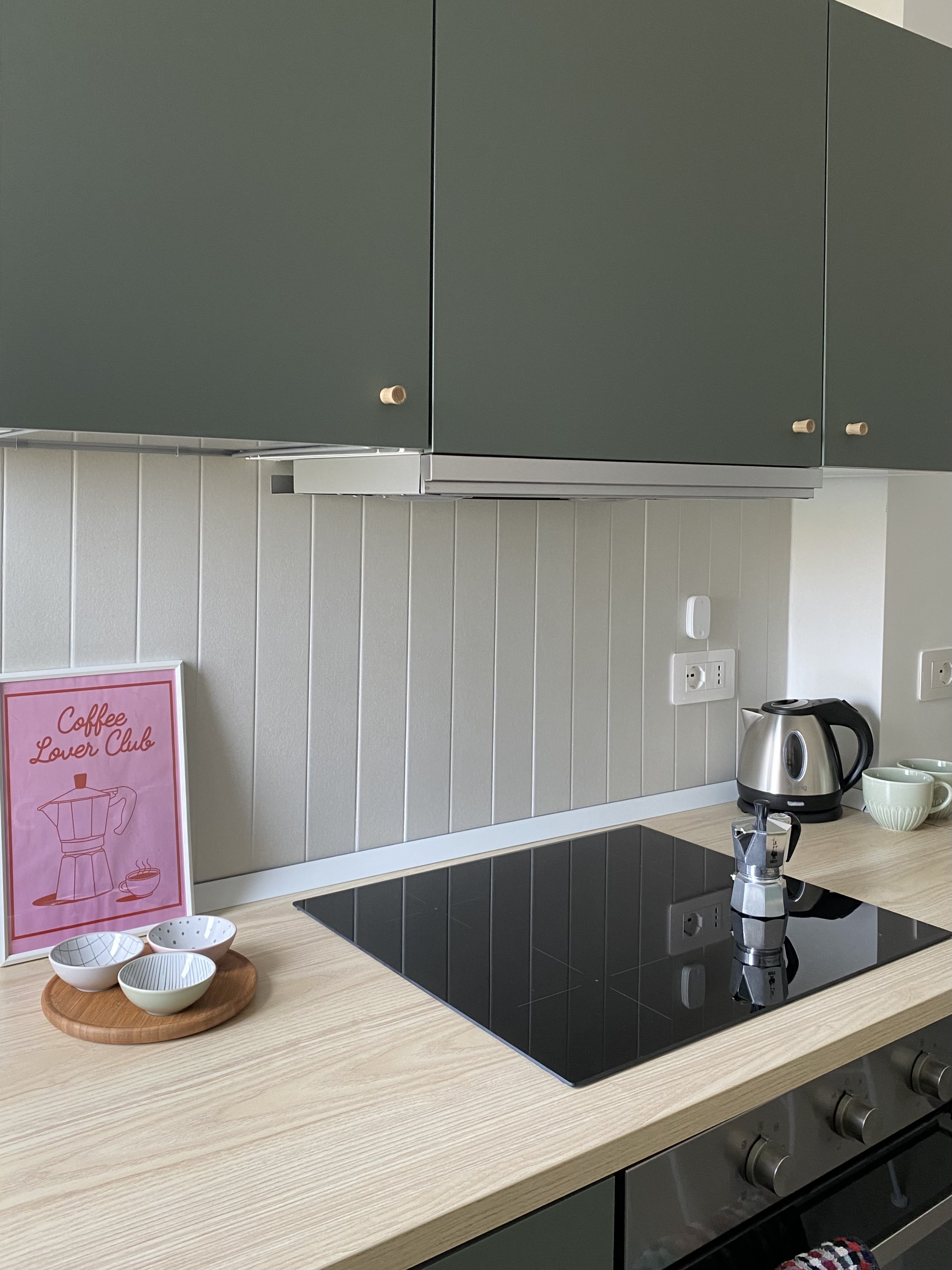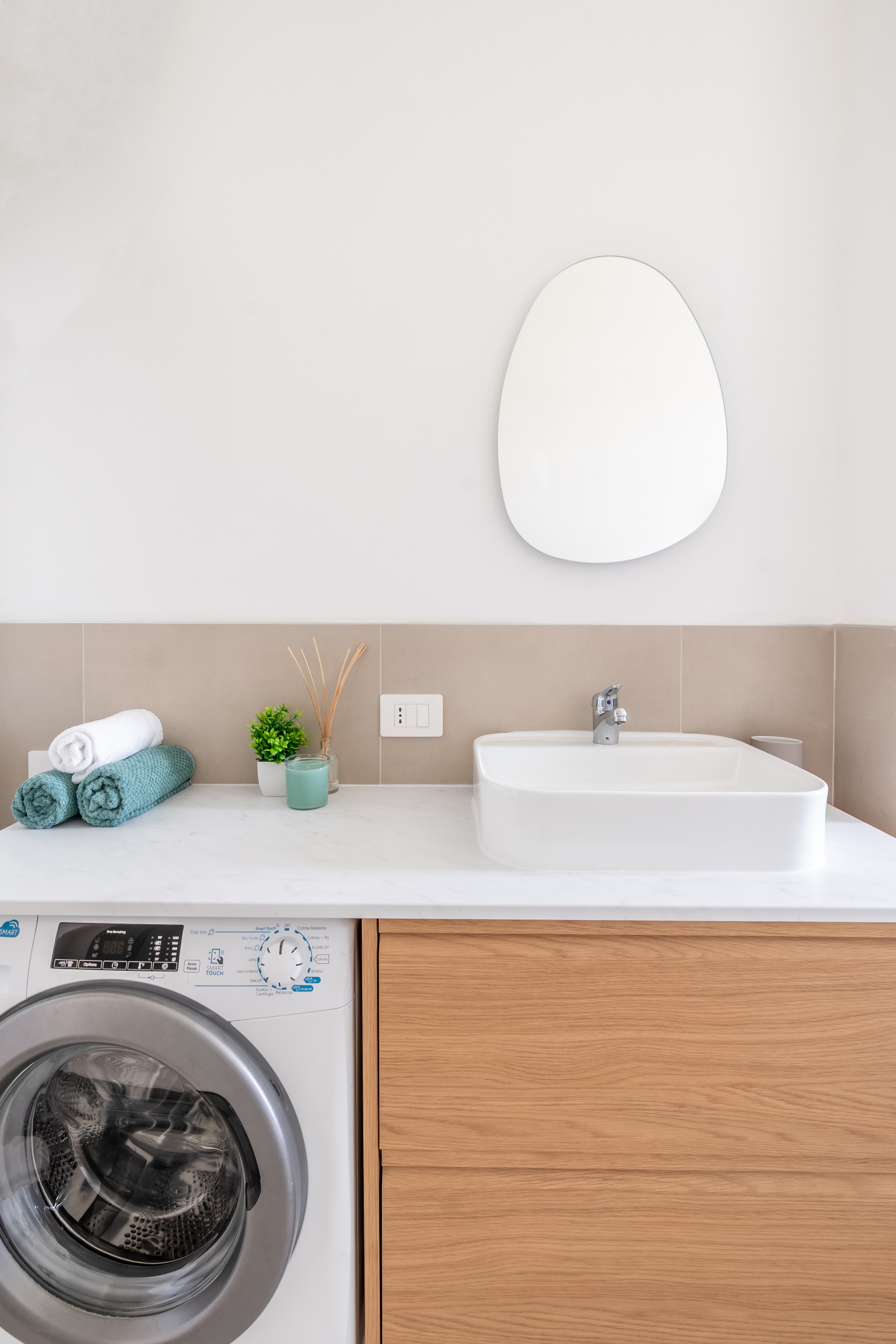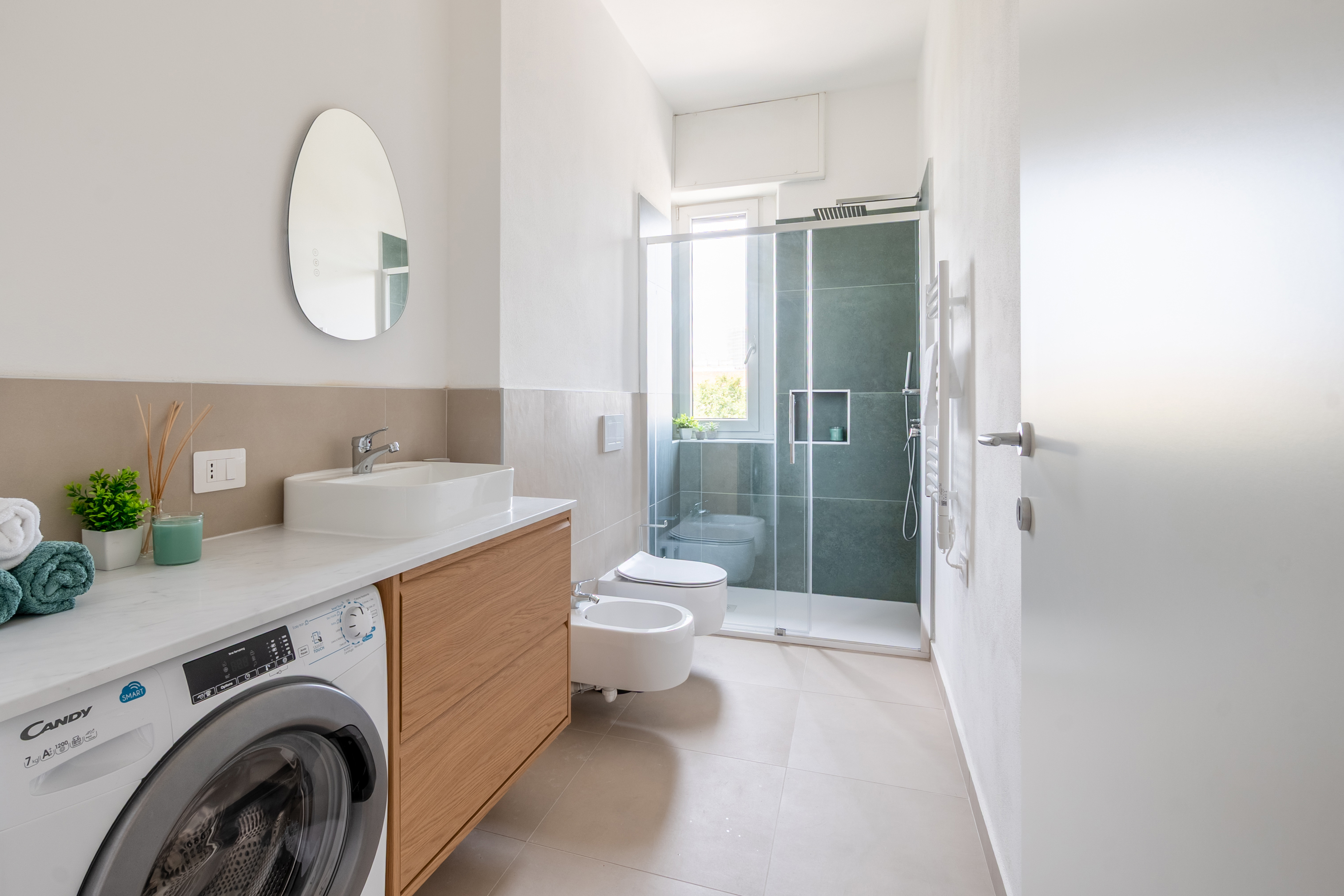Oltre alle due camere, ciascuna con una propria personalità definita da un colore distintivo – firma stilistica degli appartamenti Roofinders – abbiamo creato spazi condivisi pensati per la quotidianità: un ingresso pratico, una cucina abitabile con un grande tavolo per stare insieme e un bagno.