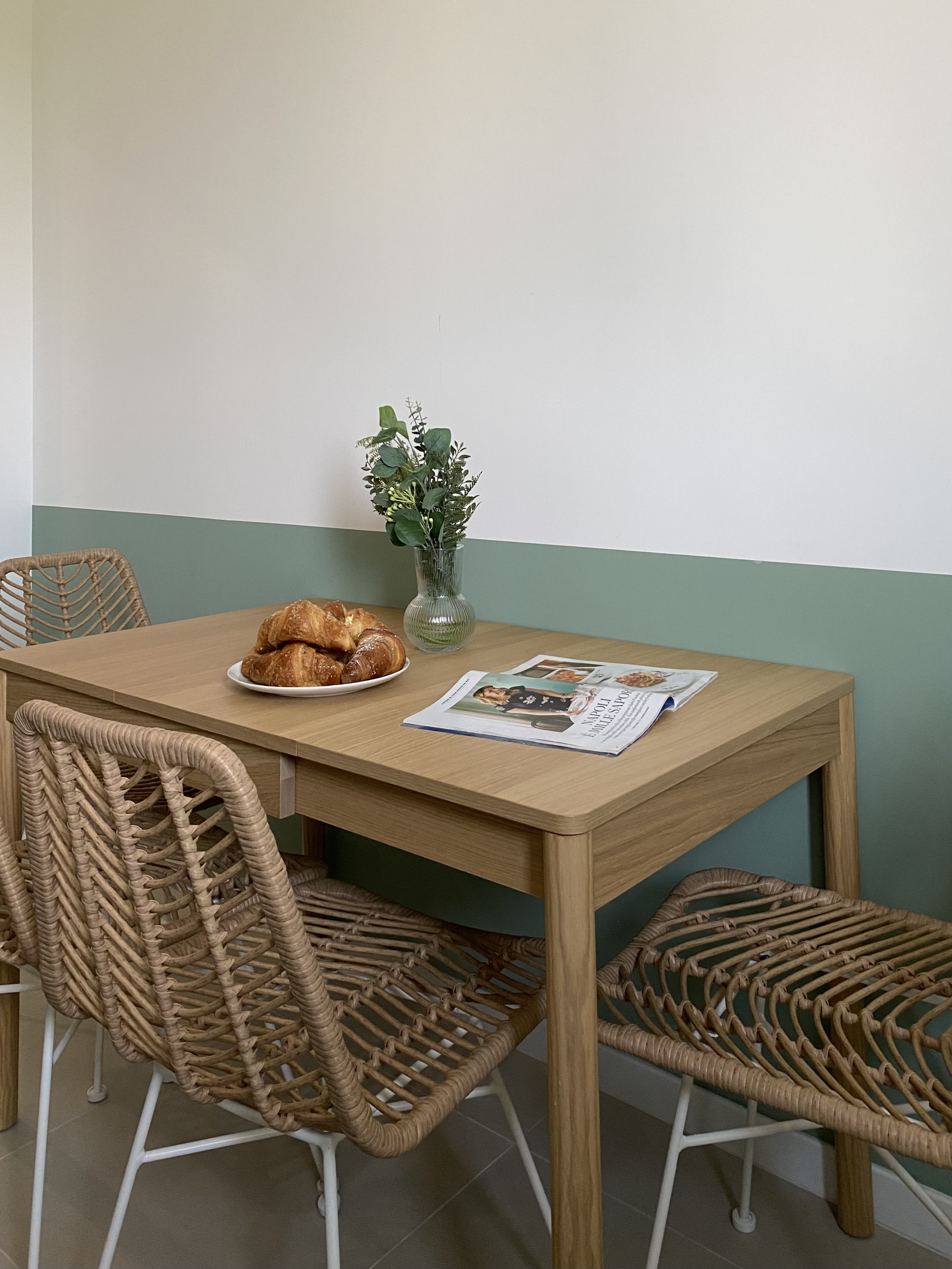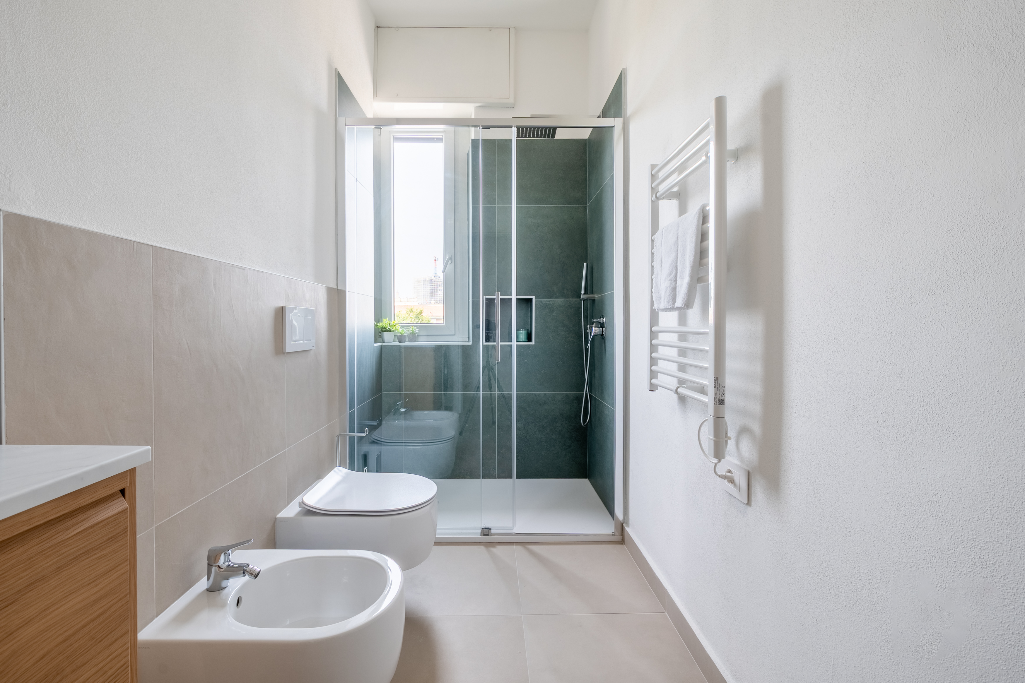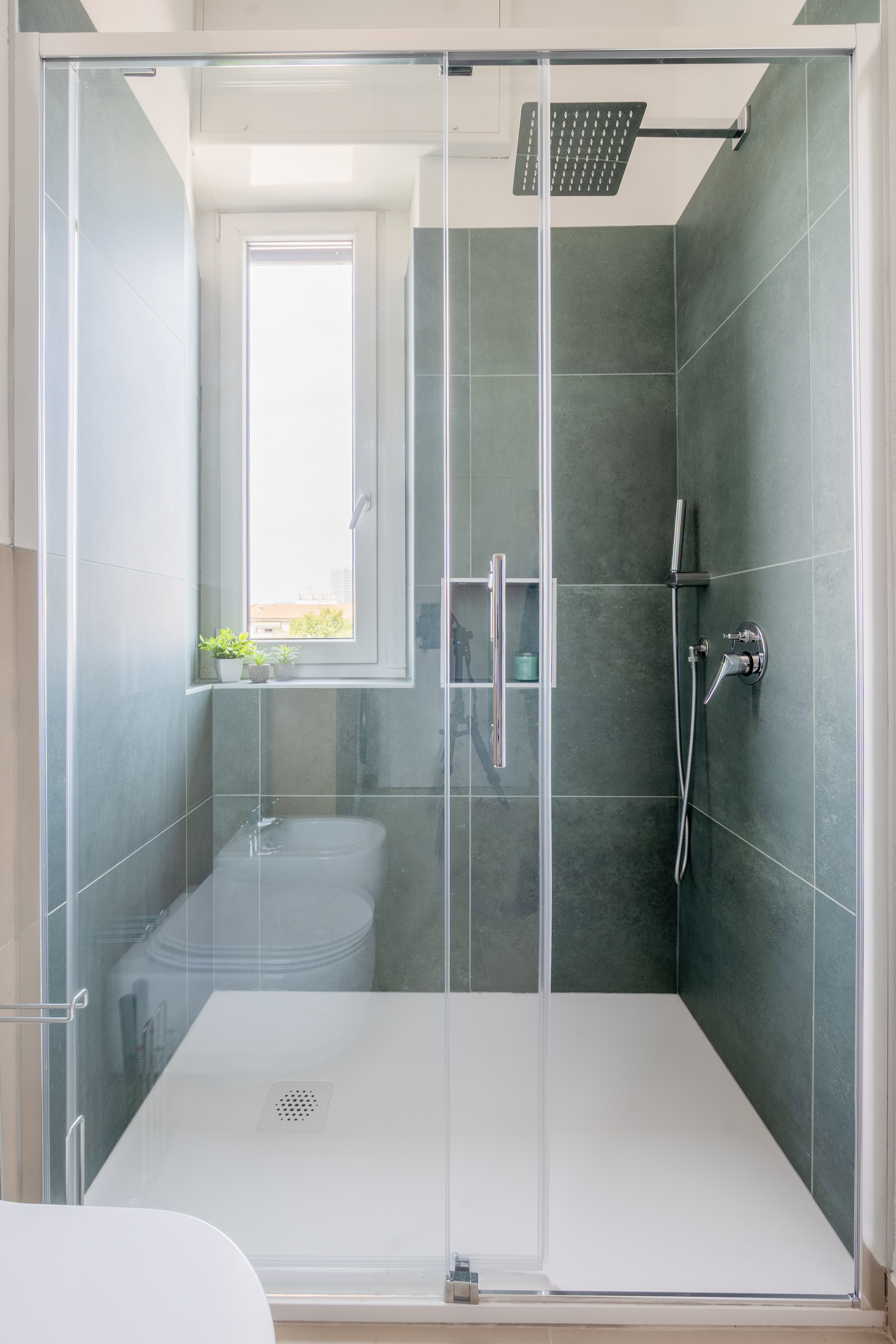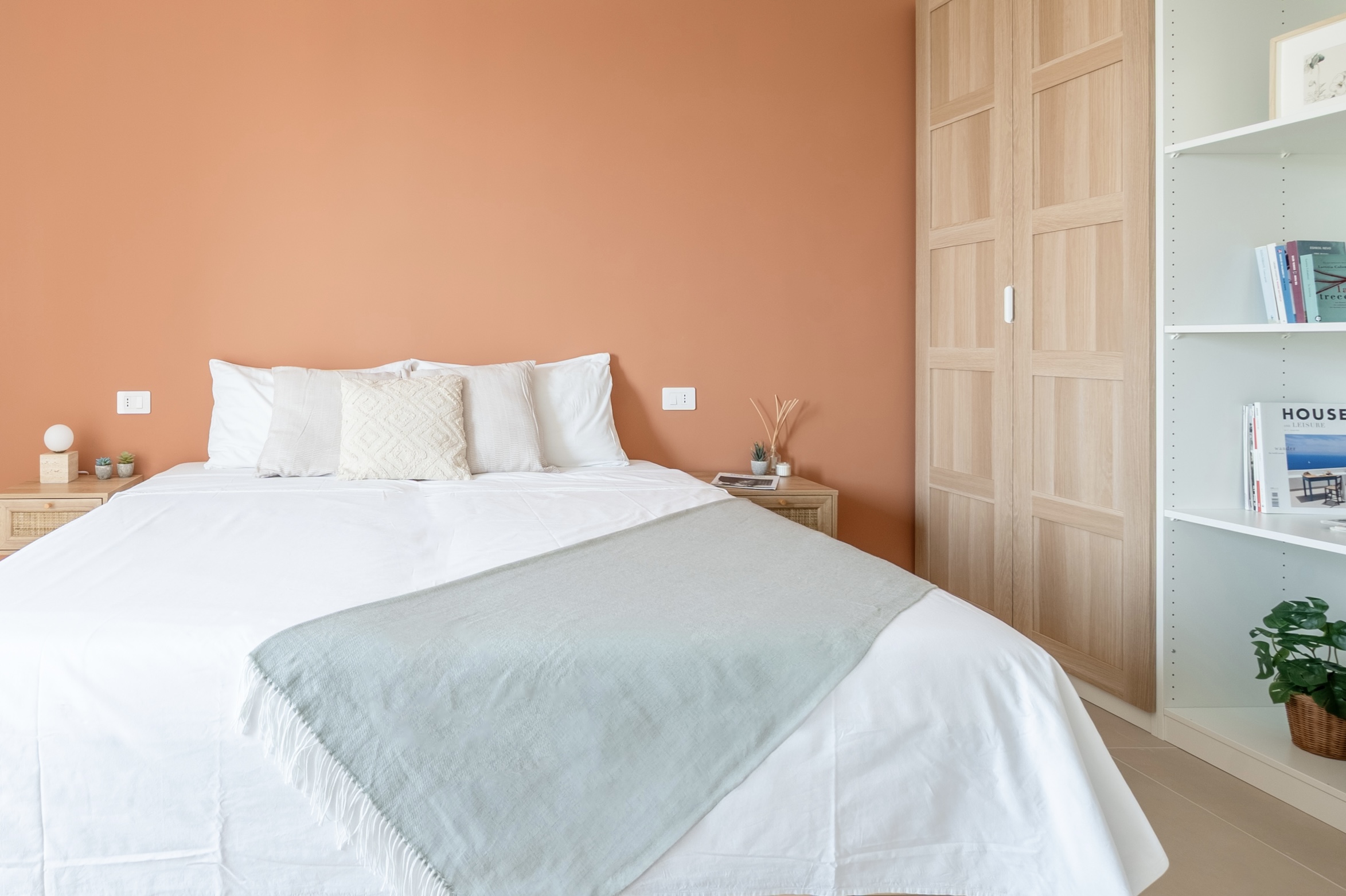 Oltre alle due camere, ciascuna con una propria personalità definita da un colore distintivo – firma stilistica degli appartamenti Roofinders – abbiamo creato spazi condivisi pensati per la quotidianità: un ingresso pratico, una cucina abitabile con un grande tavolo per stare insieme e un bagno.