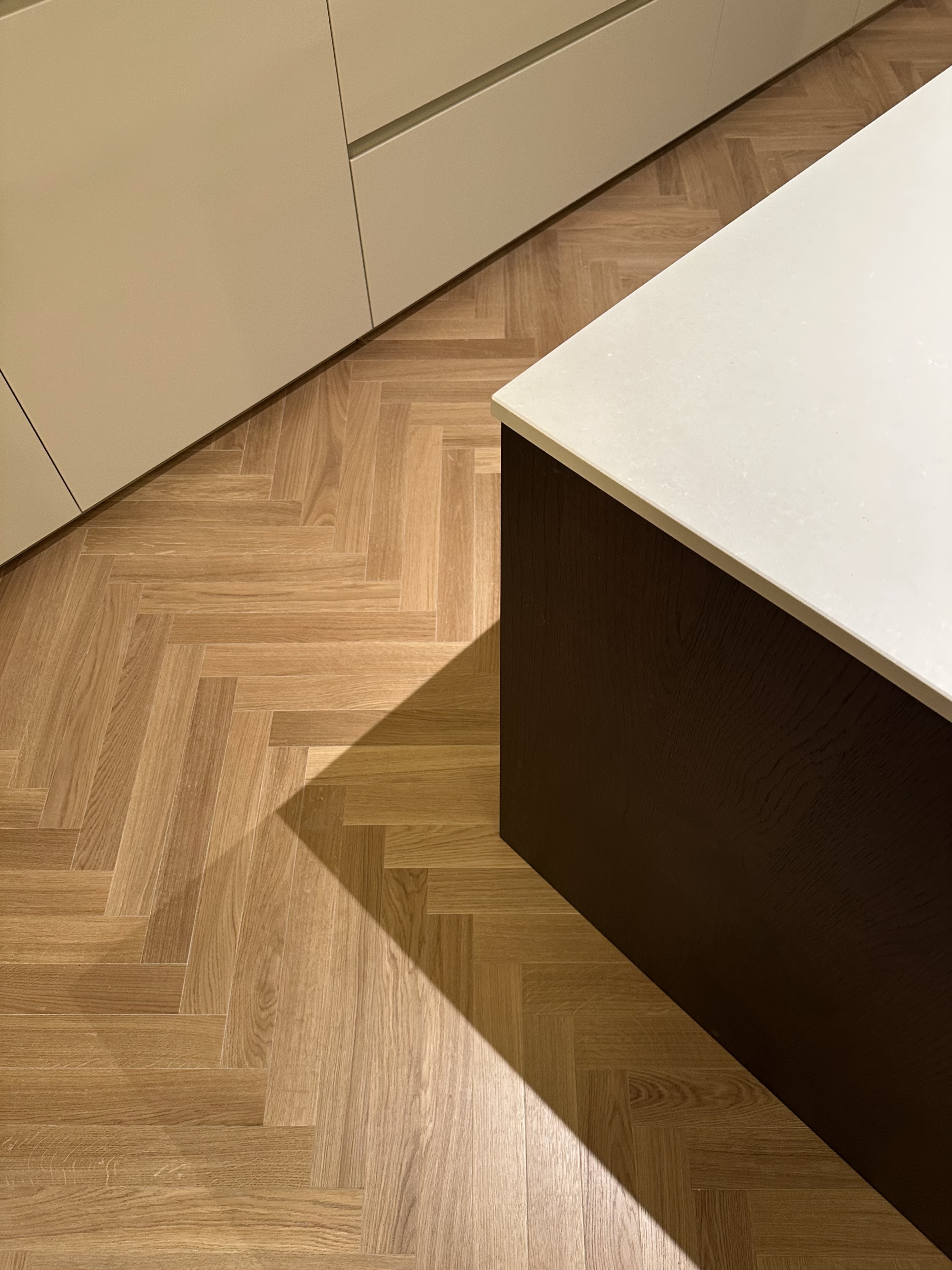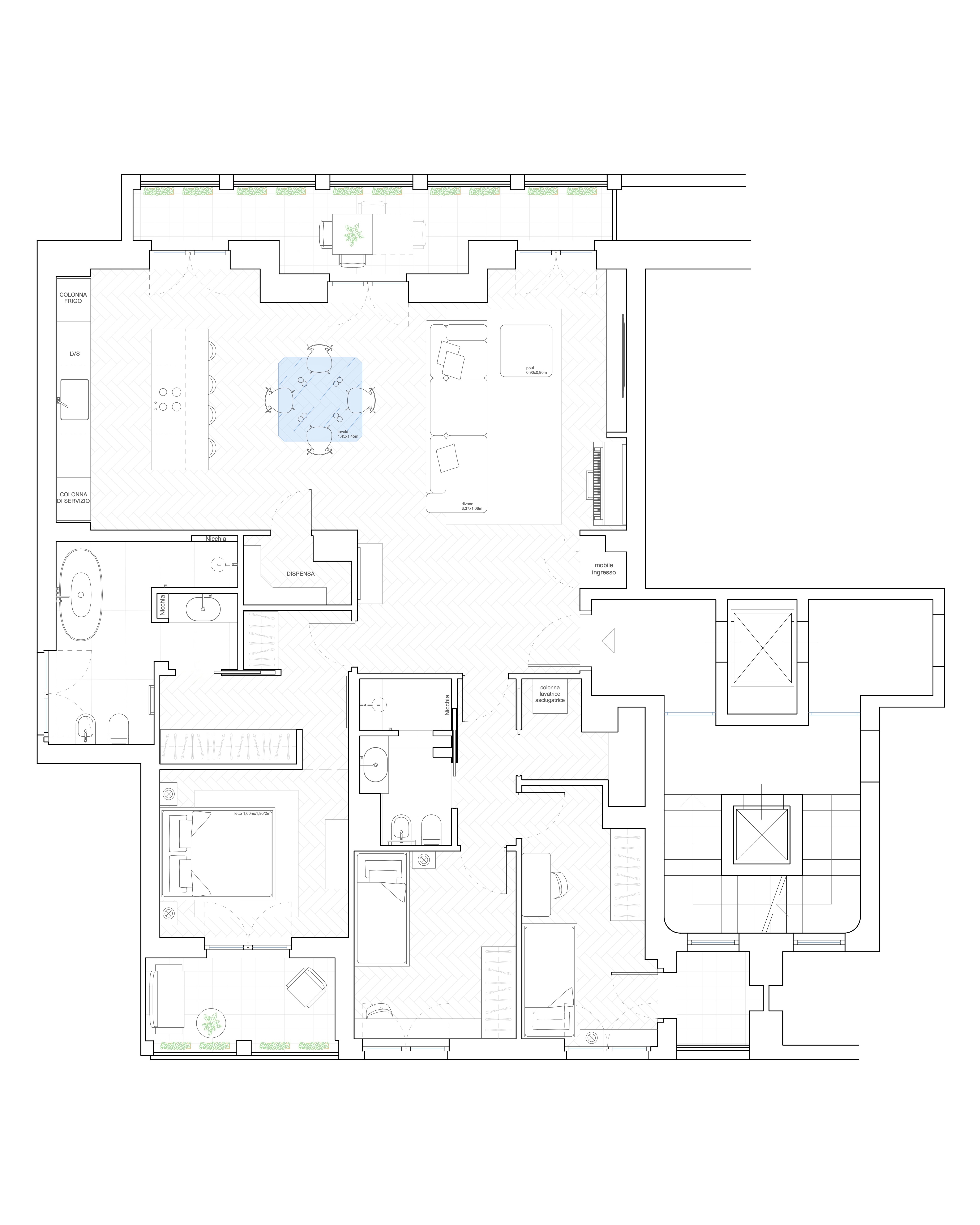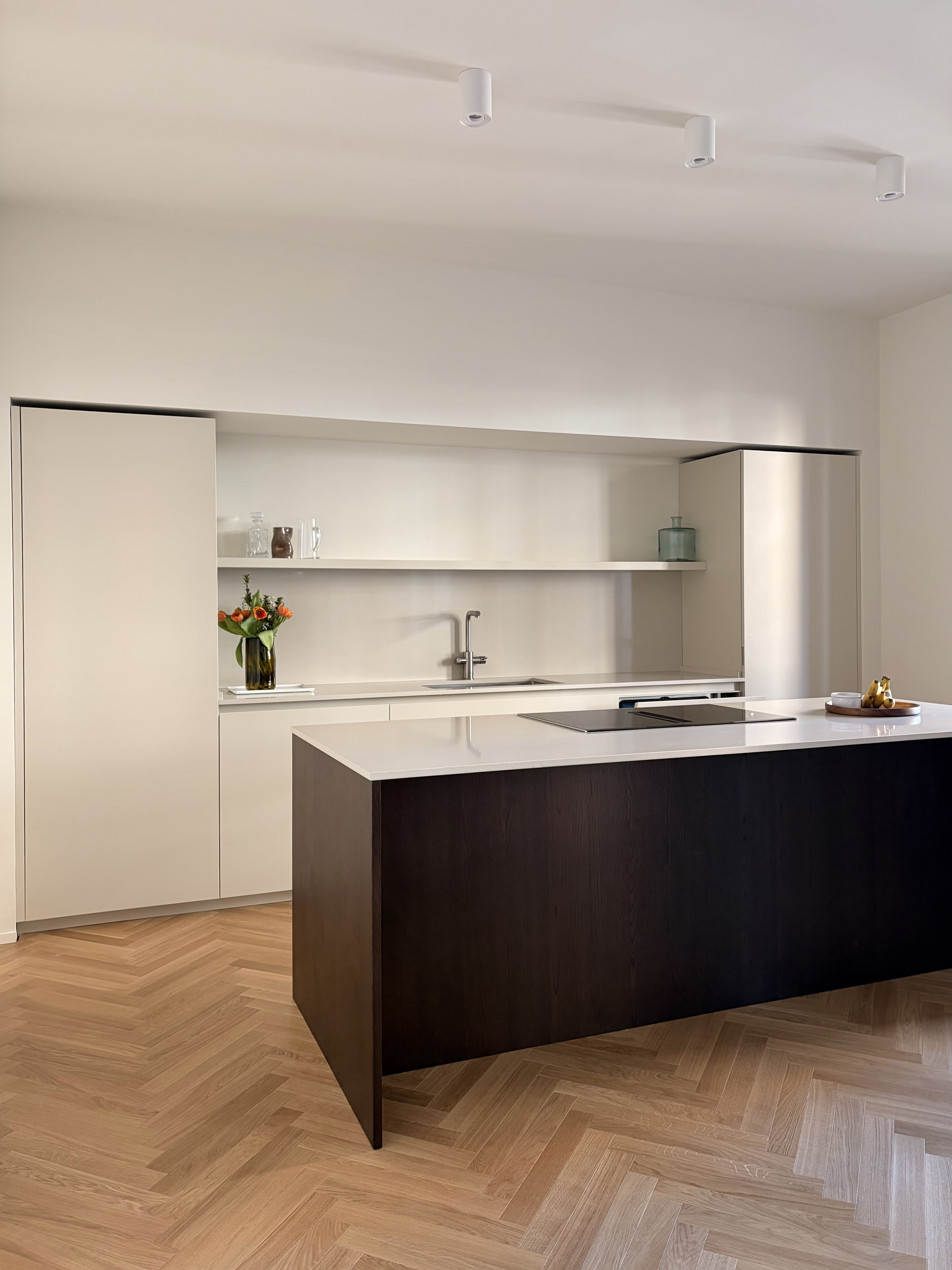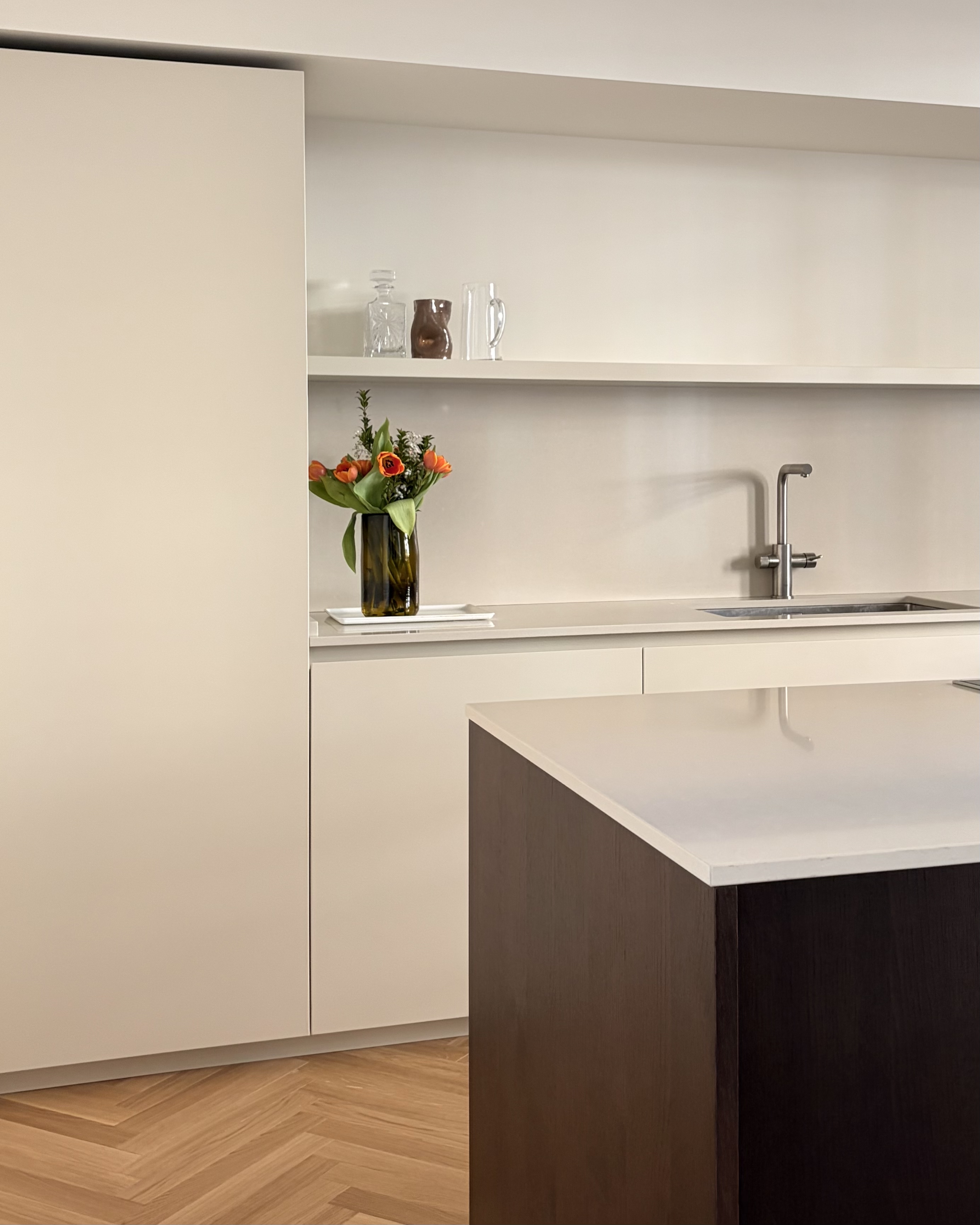 Lungo tutto l’appartamento, la luce naturale esalta le texture materiche, mentre le lunghe prospettive creano viste continue e un ritmo silenzioso e armonioso tra gli ambienti.