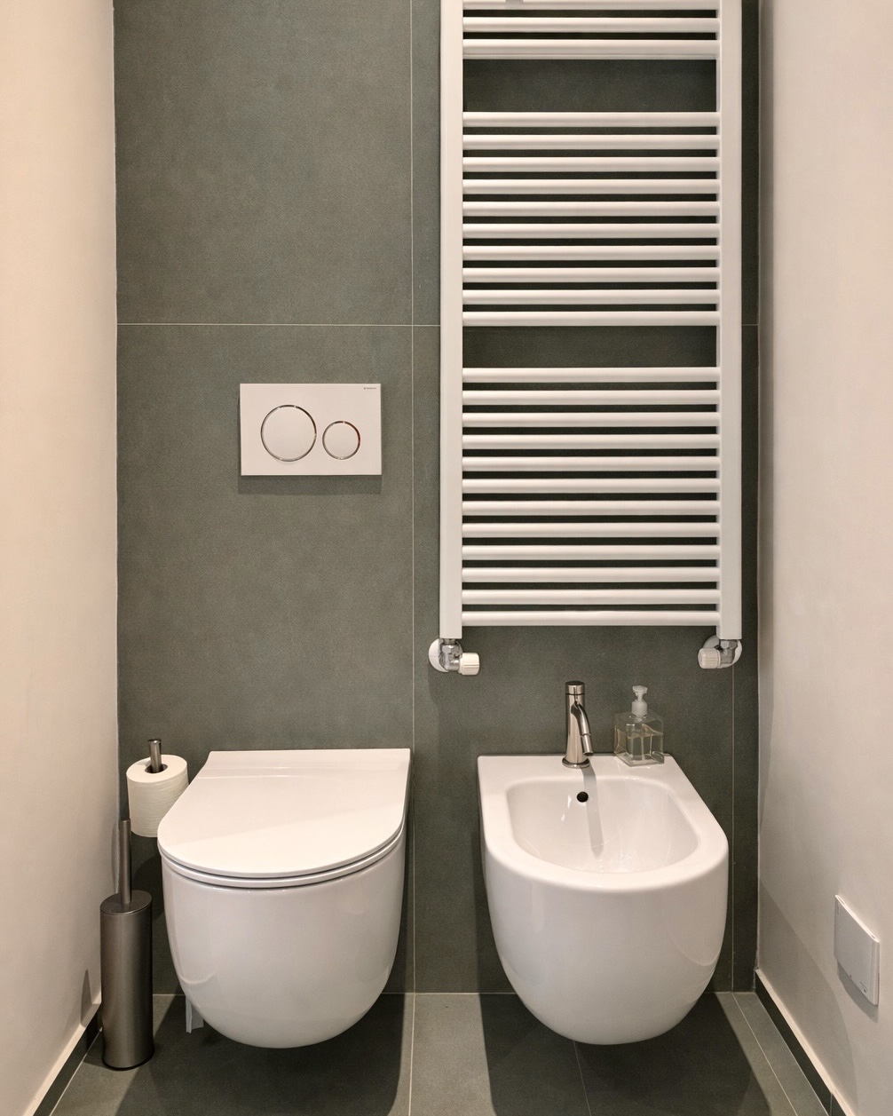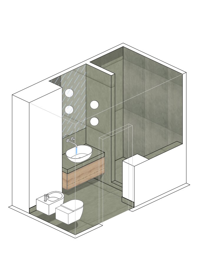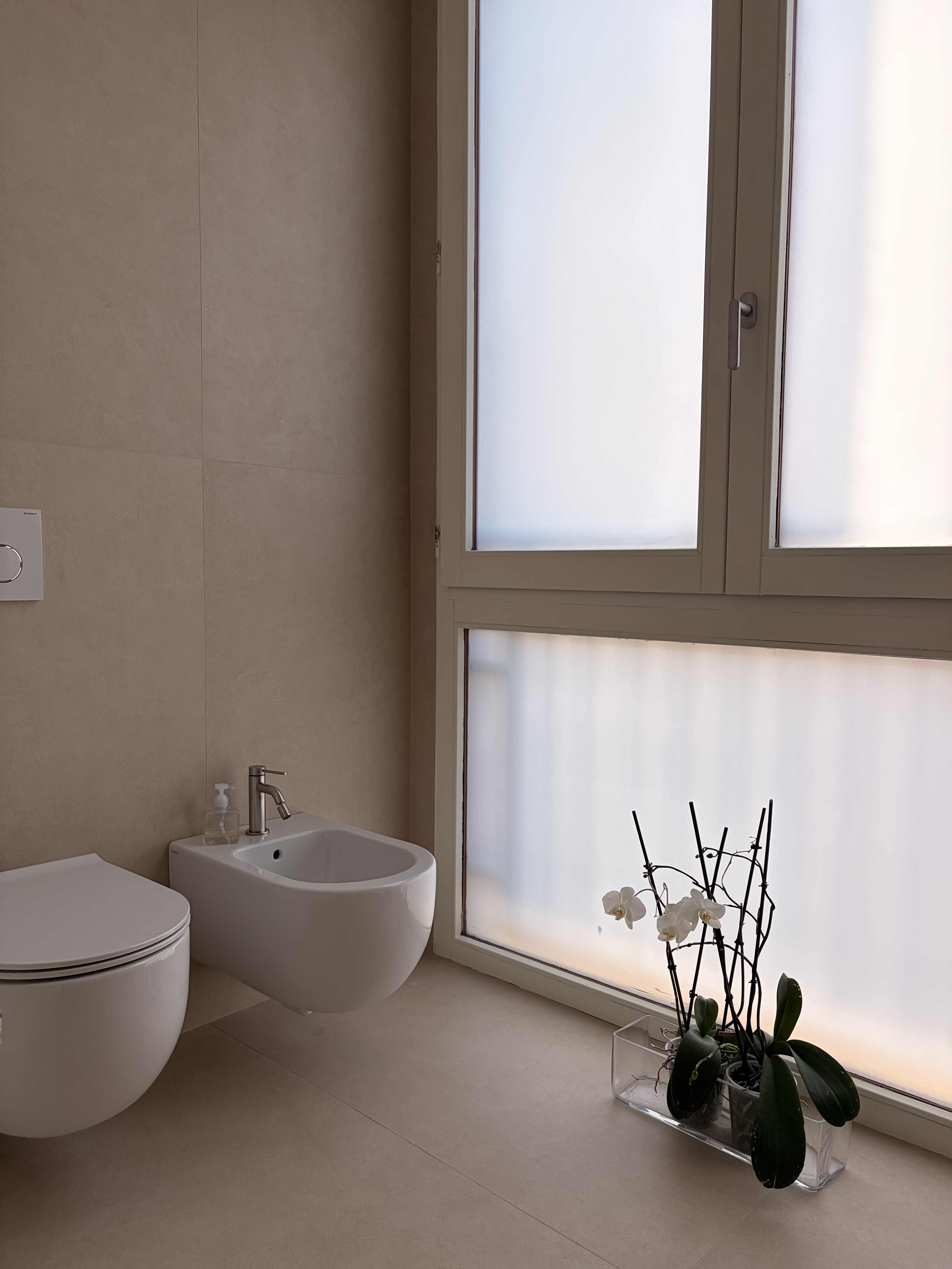 Nei bagni, tonalità calde ed elementi in legno, in contrasto con superfici effetto pietra, danno vita a un dialogo equilibrato tra minimalismo essenziale e comfort accogliente. I dettagli non cercano protagonismo, ma sostengono la vita quotidiana attraverso presenza, cura artigianale e senso di equilibrio.