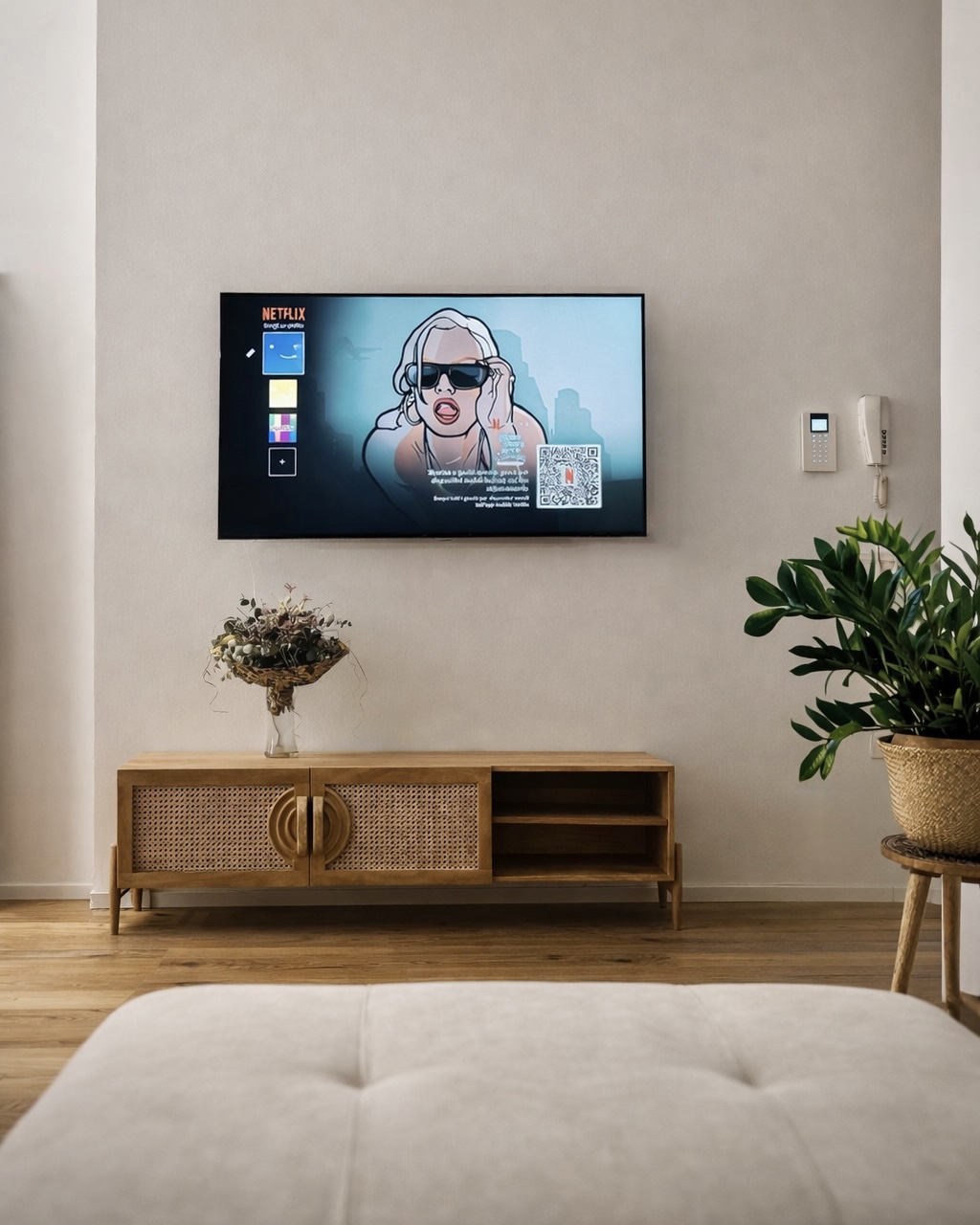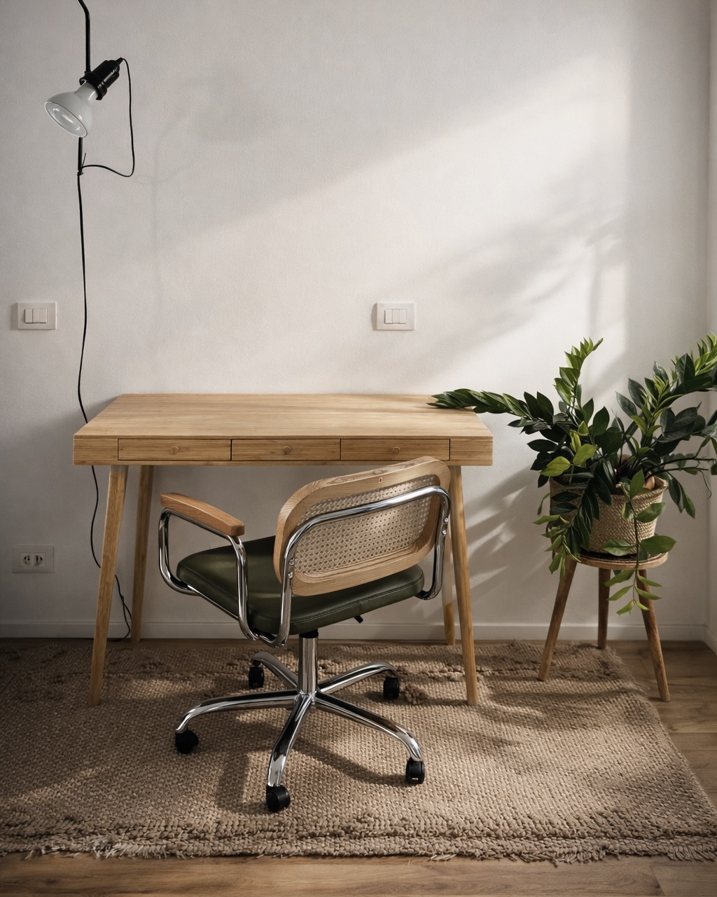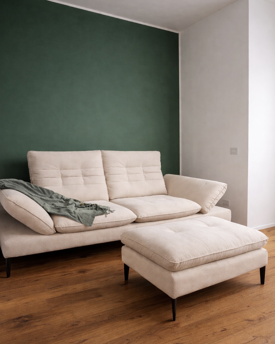Gli interni sono caratterizzati da un parquet in rovere dal forte carattere, valorizzato dalla presenza di nodi e variazioni cromatiche naturali. Il tutto è bilanciato da una palette di colori neutri ad eccezione della parete del divano in verde oliva, scelta per definire un angolo più intimo e raccolto all’interno della zona living.