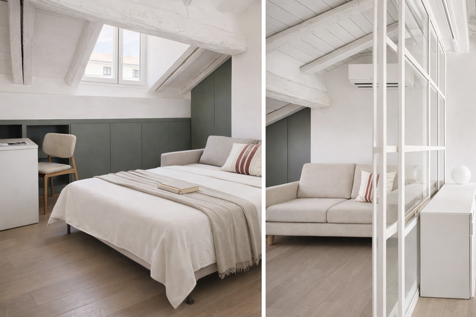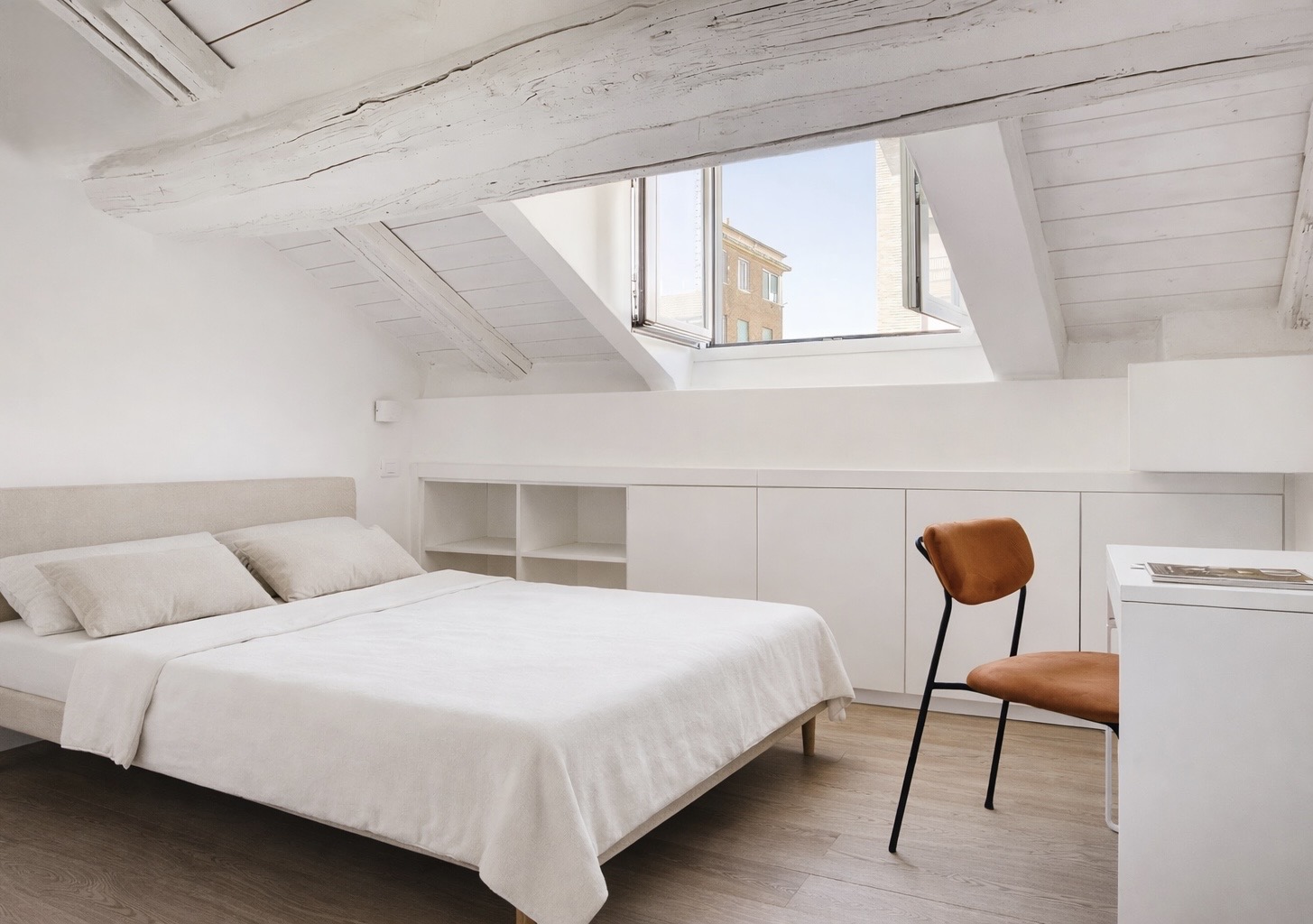 Abbiamo abbracciato la sfida della sua natura mansardata, trasformando ogni angolo in un'opportunità. Grazie a soluzioni disegnate su misura, abbiamo creato spazi contenitivi invisibili, armadi che si integrano perfettamente nell'architettura, pronti ad accogliere con discrezione abiti e oggetti personali. Inoltre con i ripostigli nascosti abbiamo risolto le esigenze di stoccaggio meno frequenti, liberando spazio e mantenendo l'eleganza degli ambienti.